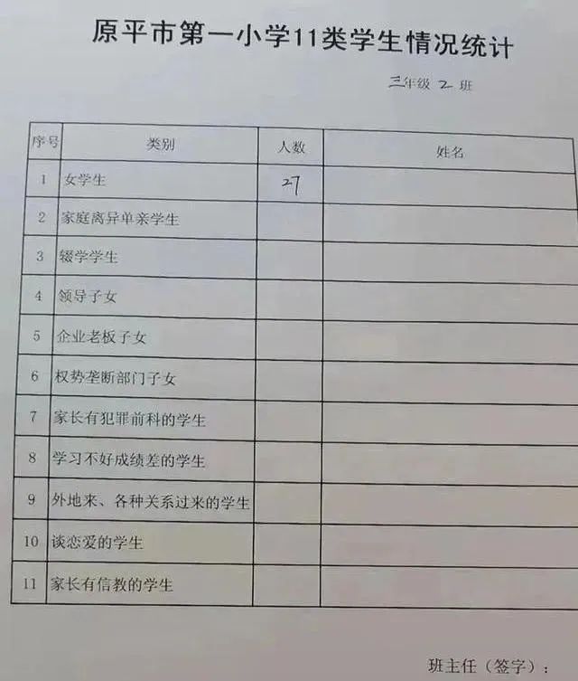 最近,山西忻州一所小学苦心发明出一张统计表,把学生分做了十一类,可谓是极大胆的天才创举。我们晓得因材施教的重要性,那么搞清楚学生究竟是块什么“材”,无疑是教学工作的第一要务。于是,这所小学呕心沥血发明出的这张统计表,学生究竟是不是可塑之才,对照表格一目了然:怎么分类呢?譬如“领导子女”、“企业老板子女”、“权势垄断部门子女”,又譬如“家庭离异单亲学生”、“辍学学生”、“家长有犯罪前科的学生”、“学习不好成绩差的学生”。